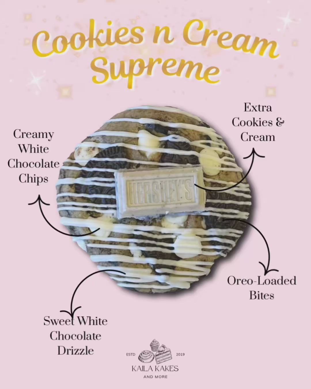 A cookies n cream lover’s dream—crushed Oreos, cookies and cream chocolate, and white chocolate chips baked into every bite, then finished with a white chocolate drizzle, more crushed Oreos, and a Hershey’s Cookies and Cream piece on top.