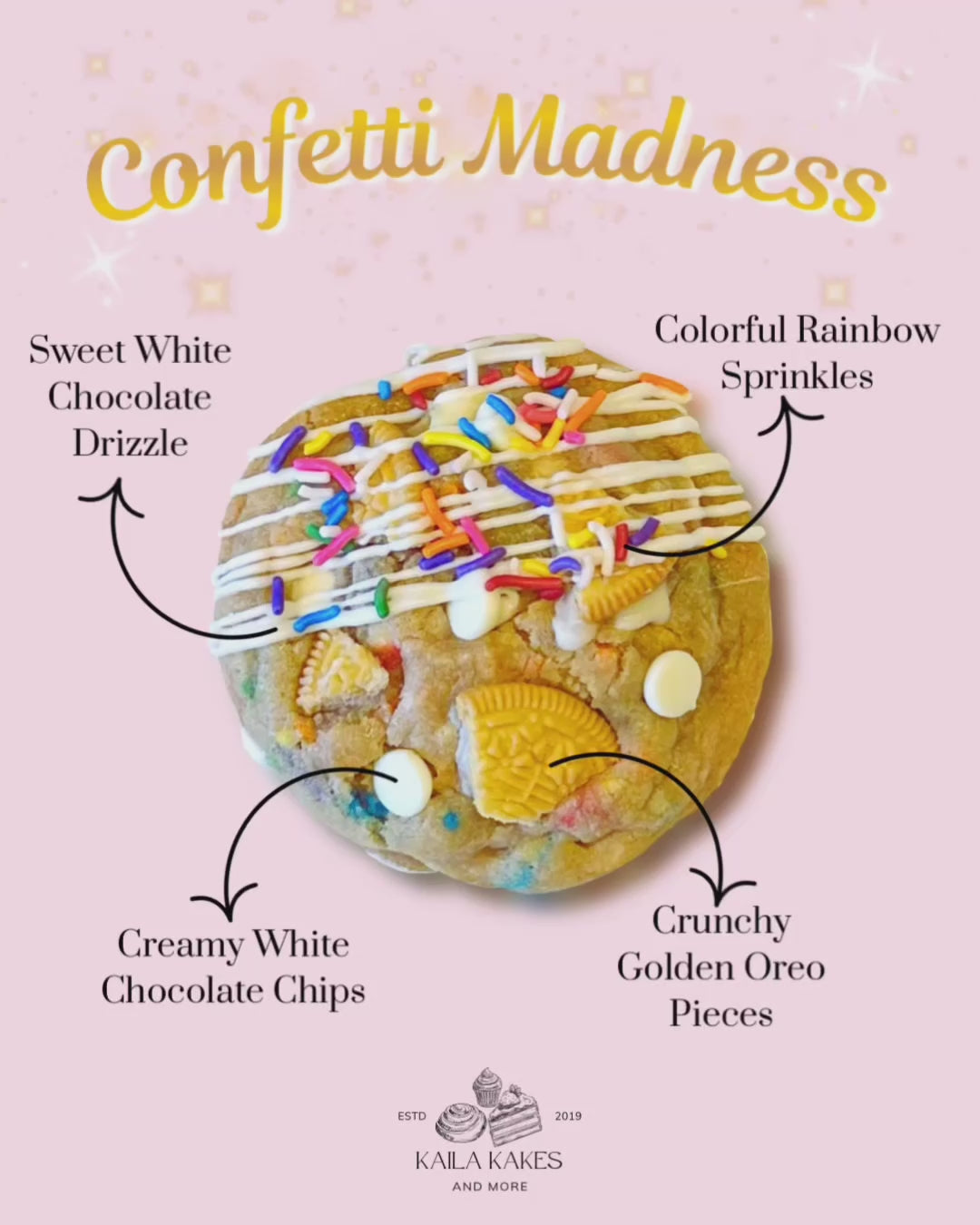 A colorful sugar cookie packed with rainbow sprinkles, crushed Golden Oreos, white chocolate chips, and a touch of cream cheese for richness.