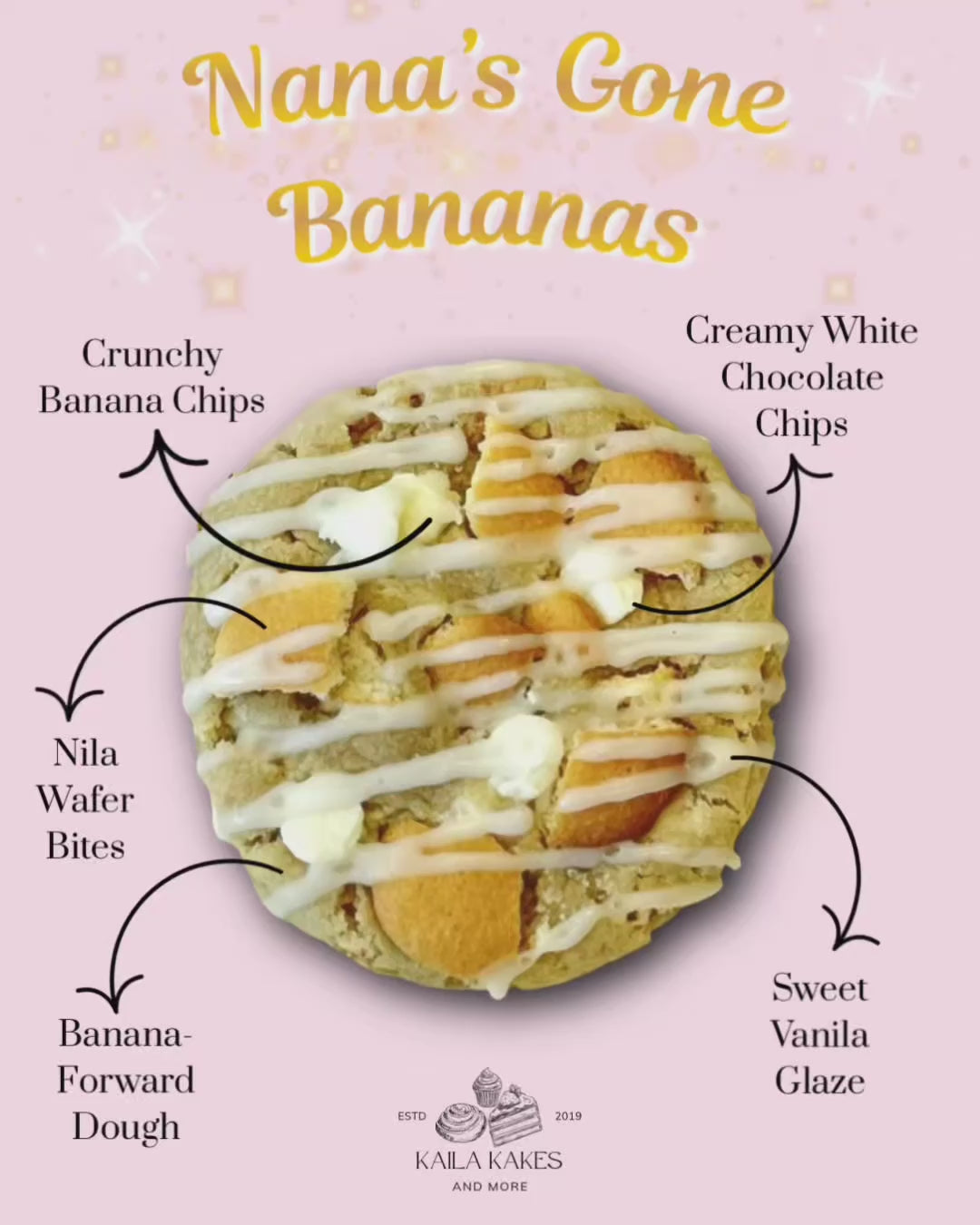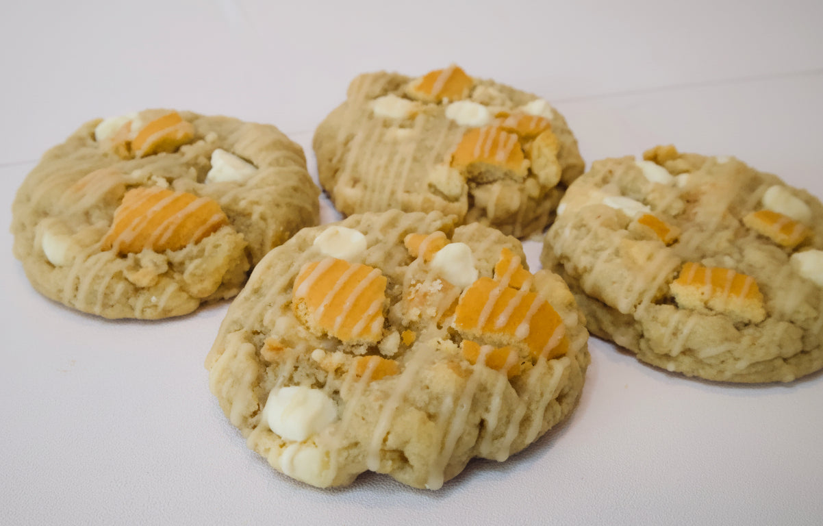 Banana pudding in cookie form—made with banana, banana chips, creamy white chocolate chips, and Nilla Wafers, then finished with a light vanilla glaze drizzle.