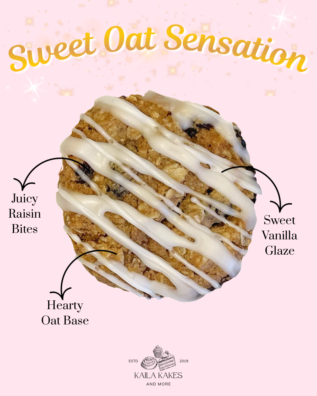 Made with brown butter, plump raisins, rolled oats, and a warm blend of cinnamon and nutmeg. Finished with a vanilla glaze drizzle for a sweet touch.