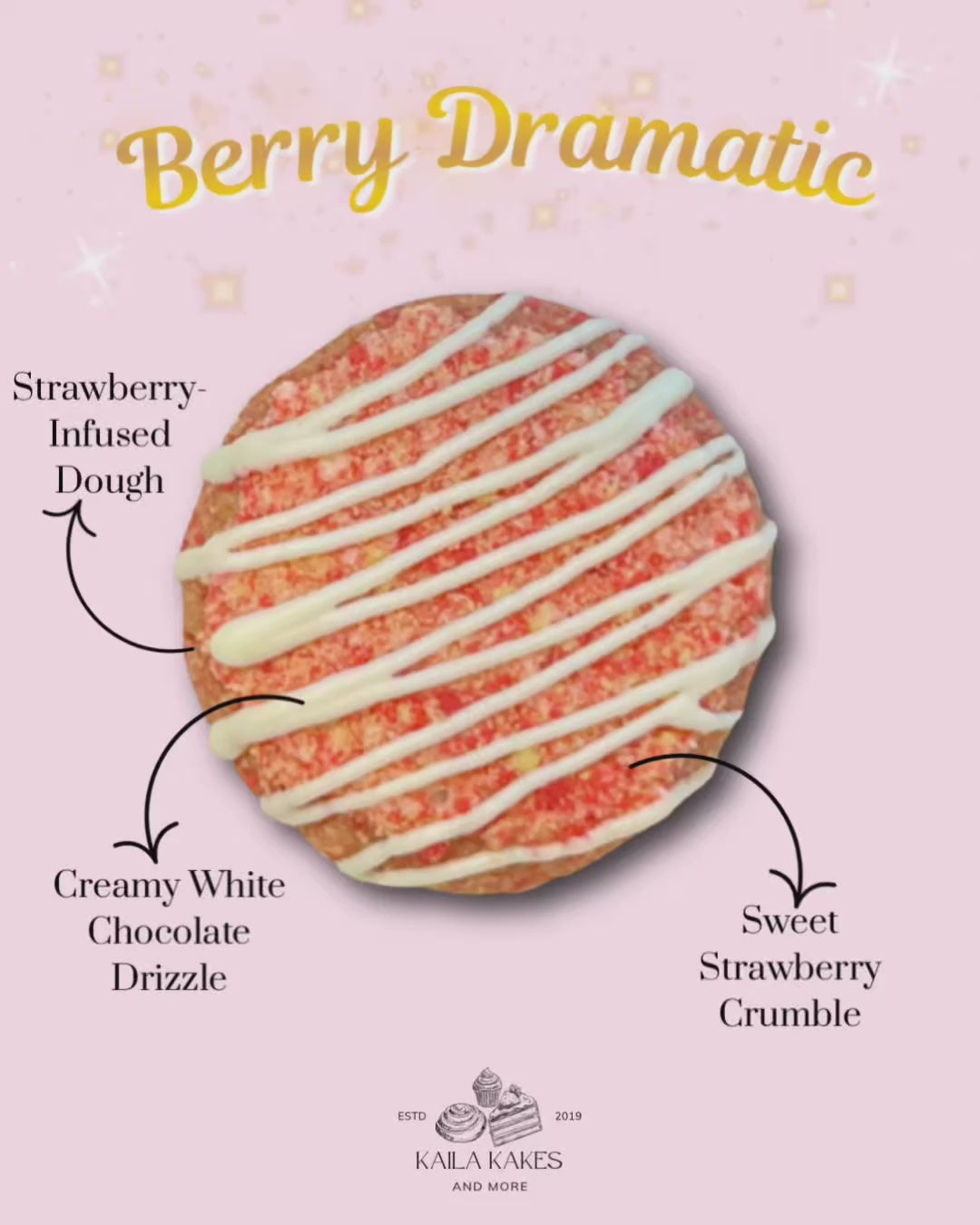 A vanilla-strawberry cookie made with strawberry emulsion, filled with strawberry crunch crumble and finished with a white chocolate drizzle and more crumble on top.